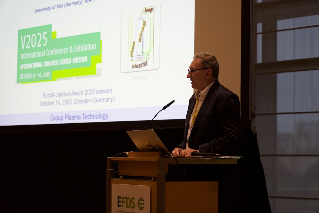 Im Rahmen der International Conference & Exhibition for Thin Films and Surface Treatment V2025 (13. – 16. Oktober 2025 in Dresden) wurde Prof. Holger Kersten für herausragende wissenschaftliche Beiträge zur Plasmaphysik, Plasmadiagnostik und zum Plasma-basierten Schichtwachstum gewürdigt. Prof. Kersten ist seit vielen Jahren in mehreren Verbänden der Plasmatechnologien sehr aktiv. Neben seiner fachlichen Arbeit unterstützt er die Nachwuchswerbung für den Bereich der Plasmatechnologie durch eindrucksvolle Experimentalvorträge und begeistert so auch viele Nicht-Fachexperten für den Fachbereich. Diese Begeisterun ist auch in seinen Vorlesungen und im Institut deutlich zu spüren.